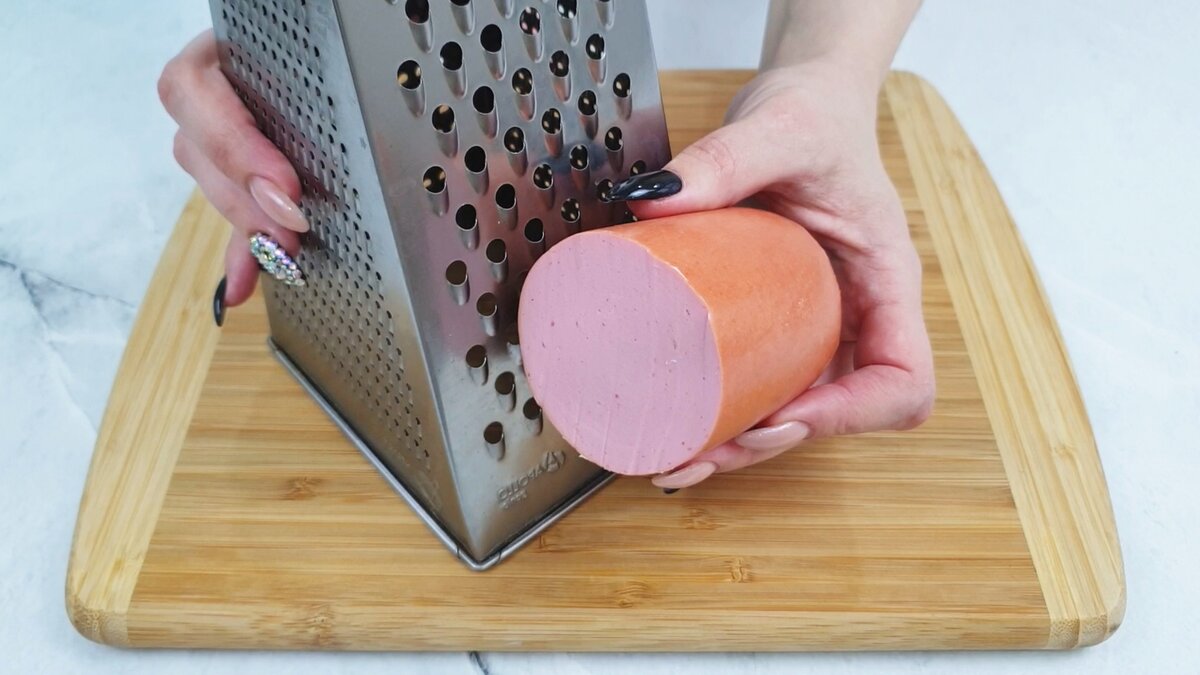 Если остался кусочек колбаски, просто натираю его на терке: готовлю быстрый завтрак на сковороде