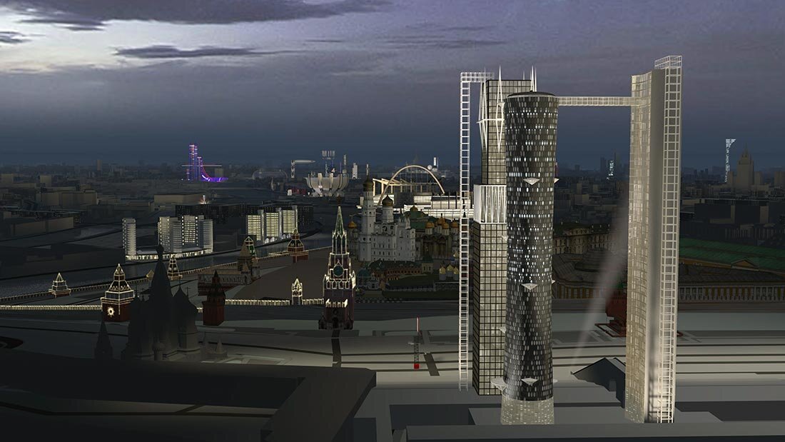 Трёхмерная Москва и проекты авангардистов 20-30-х годов XX века на новом ночном видео. Добавлены новые 3D-модели: Проуны — горизонтальные небоскрёбы Эль Лисицкого на Садовом кольце, Центральный телеграф Алексея Щусева, Наркомтяжпром А.Г. Мордвинова, трибуна для площади Эль Лисицкого, центральный рынок на Софийской набережной, Дворец советов Ле Корбюзье, склад Михаила Коржева, несколько фантазий Якова Чернихова, архитектон К. Малевича, небоскрёбы-композиции ВХУТЕМАСа, Дом промышленности и торговли А. Сильченкова, несколько павильонов и другие объекты. Скоро мы расскажем подробнее о каждом из этих нереализованных объектов. Сохранился пояснительный текст Лисицкого к «Трибуне»: «Проект разработан в архитектурной мастерской, руководимой Лисицким, в Витебской академии в 1920 году. Выполнялся из железа, этернита, стекла высотою примерно 12 м. Нижний куб ─ основание из прозрачного металла, содержит мотор, обеспечивающий сооружение в целом. По средней части конструкции, выполненной из стекла,