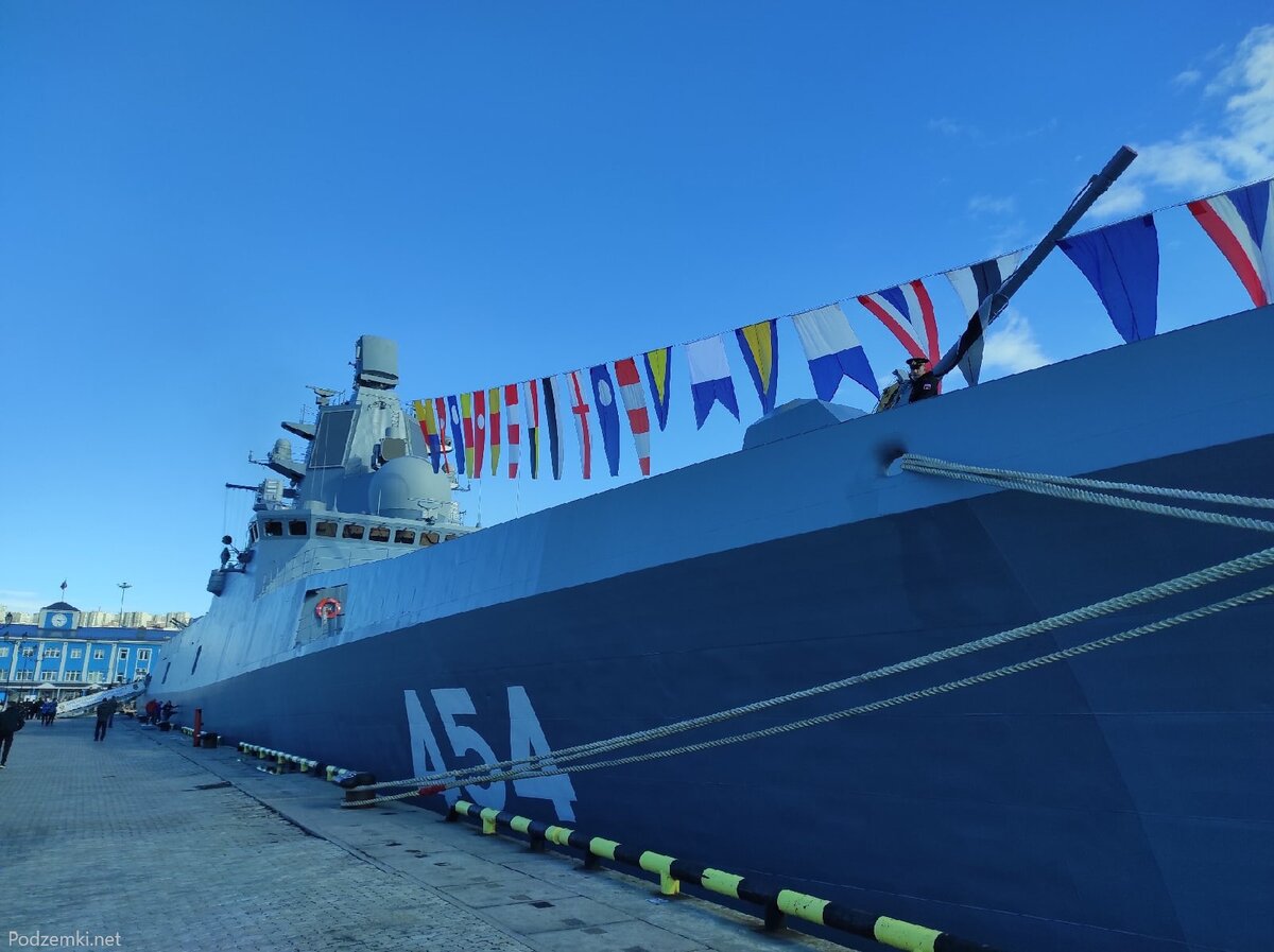 В прошлом году фрегат Адмирал Горшков заходил с визитом в Мурманск. В честь этого события все желающие могли пройтись по палубе нового военного корабля и даже осмотреть его вооружение. Мне удалось посетить этот корабль когда он только-только пришвартовался, на фото даже ещё видно буксиры. В кормовой части корабля видно отсек для буксируемой противолодочной гидроакустической станции "Минотавр-ИСПН" (в ряде источников указывается, что устанавливаться может также и "Виньетка-ЭМ"). Видно установки зенитного ракетно-артиллерийского комплекса "Палаш", станцию связи "Центавр НМ-1" и РЛС "Фуркэ-4". Предположительно, комплекс радио-электронной борьбы ТК-28. Поднимемся на палубу. Ангар под вертолёт Ка-27ПЛ/Ка-31 или БПЛА "О