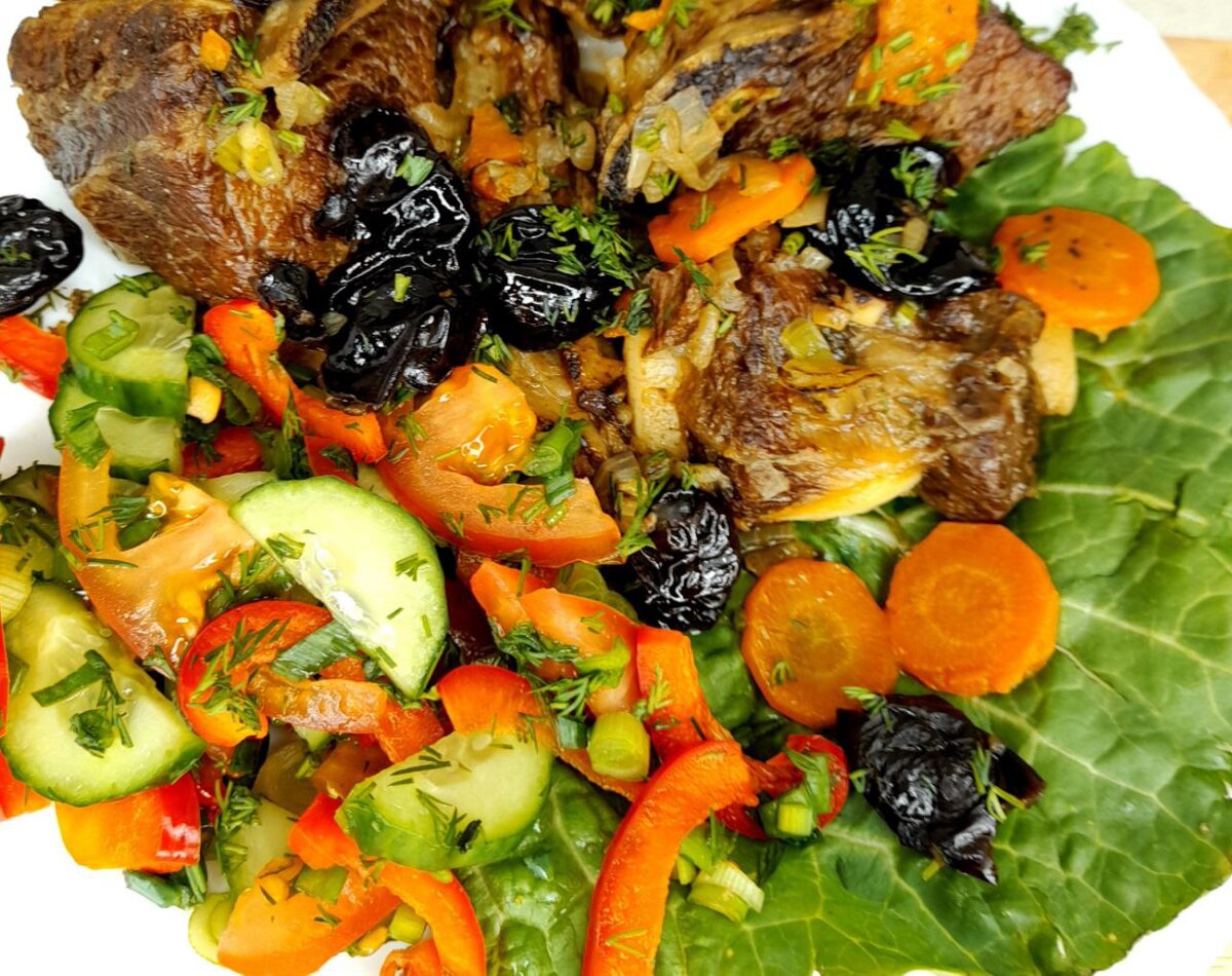 Это говяжьи рёбрышки, тушенные с черносливом, потрясающе вкусное мясное блюдо. Вкусно, сытно и аппетитно! Не так часто я их готовлю. Но когда мои домашние узнают, что сегодня будут рёбрышки, ждут с нетерпением. Блюдо невероятно аппетитное, устоять просто невозможно. Берем: - говяжьи рёбрышки- 1 кг - лук - 2-3 шт - морковь - 1 шт - чернослив - 100 гр(без косточки) - соль, перец - по вкусу - перец горошек - 4-5 шт - лавровый лист - 1шт - зелень нарезанная Рёбрышки моем, обсушиваем бумажным полотенцем Разогреваем сковороду на самом сильном огне. Обжариваем ребра, до корочки (обжариваем без использования масла и жиров) Нарезаем лук полукольцами Морковь кружочками Обжариваем на сухой сковороде до золотистого цвета. Стараюсь, как можно меньше использовать жиров. Если в приготовлении можно обойтись без них, использую сухую сковороду для обжарки. Рёбрышки с луком и морковью выкладываем в кастрюлю, заливаем до середины объёма мяса горячей водой и доводим до кипения на сильном огне. После за