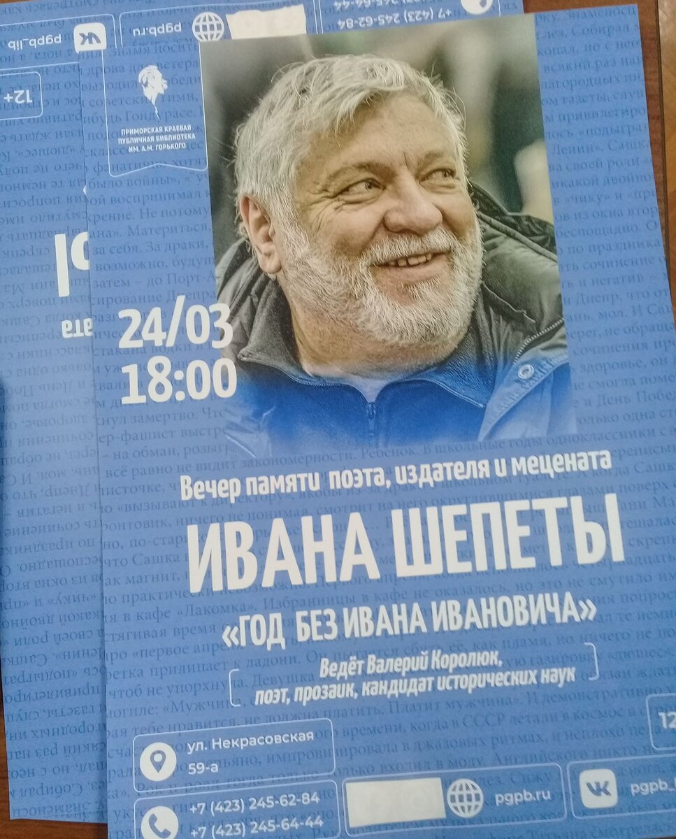 Год прошёл, как литературное Приморье простилось с поэтом, прозаиком, издателем, педагогом и меценатом, членом Дальневосточного отделения Русского ПЕН-центра, лауреатом премии газеты «Литературная Россия» Иваном Шепетой. Друзья, соратники, почитатели его таланта собрались в Приморской краевой публичной библиотеке им. А.М. Горького на годовщину скорбной даты ещё раз поговорить о значении творчества Ивана Шепеты и его влиянии на литературный процесс в Приморье и на Дальнем Востоке, информирует «Тихоокеанская Россия», ТоРосс.