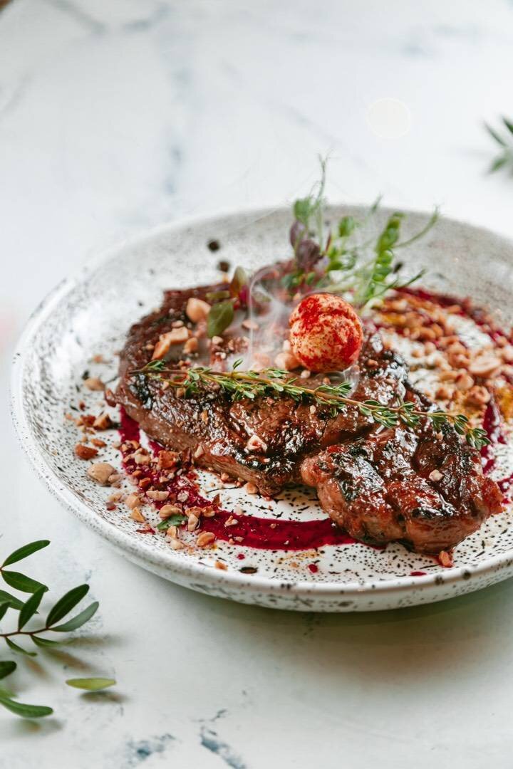Ингредиенты: Толстый край говядина, Тростниковый сахар, Соль, Перец, Оливковое масло, Копченая паприка, Масло сливочное, Фундук Способ приготовления: Мясо должно быть комнатной температуры, дайте ему отдохнуть минут 25 после холодильника, маринуем солью, перцем и копченой паприкой с двух сторон, далее поливаем оливковым маслом и посыпаем тростниковым сахаром, маринуется буквально 5 минут. Обжариваем на сковороде или костре по 2.5 минуты с каждой стороны в зависимости от той прожарки которую вы любите. Украшаем сливочным маслом посыпаем копченой паприкой, и мелко резаным фундуком Зелень на ваше усмотрение, я украсил микро зеленью ростками гороха и веточкой тимьяна. Рекомендую подавать с соусом в данном случае подавая с ягодным дрессингом из черники.