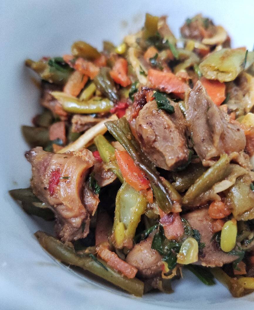 Ингредиенты: желудочки куриные, стручковая фасоль (у меня заморозка), морковь, лук репчатый, зелень (зелёный лук, укроп и петрушка), чеснок, соевый соус, перечная паста (можно заменить на томатную), оливковое масло, приправа «куриный бульон», кориандр молотый (не обязательно)