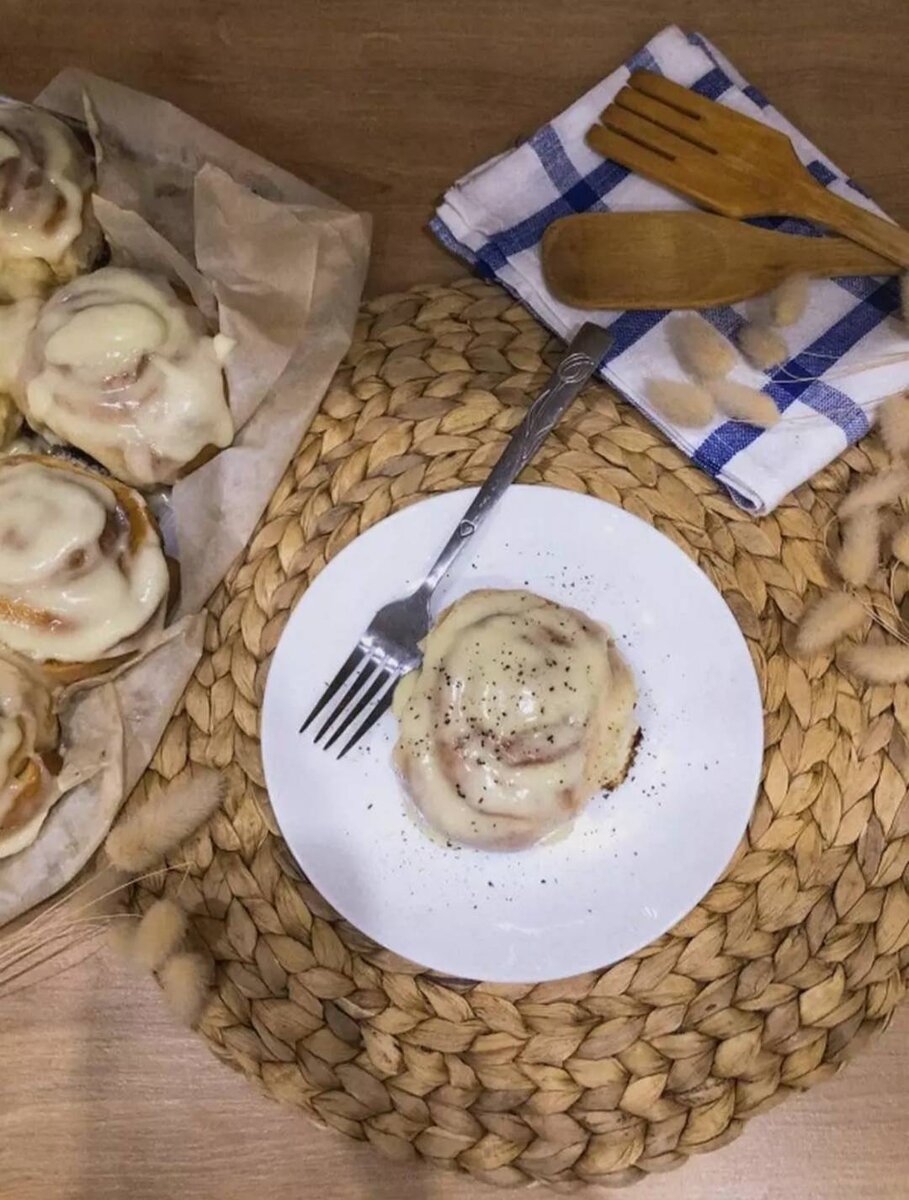 Ингредиенты: Тесто, молока, муки, дрожжей, яйца, сахара, растопленного сливочного масла, соли, ванилин, Для начинки, корицы, мягкого сливочного масла, сахара, Для сливочной помадки, сливочного сыра (маскарпоне), мягкого сливочного масла, сахарной пудры, ванилин