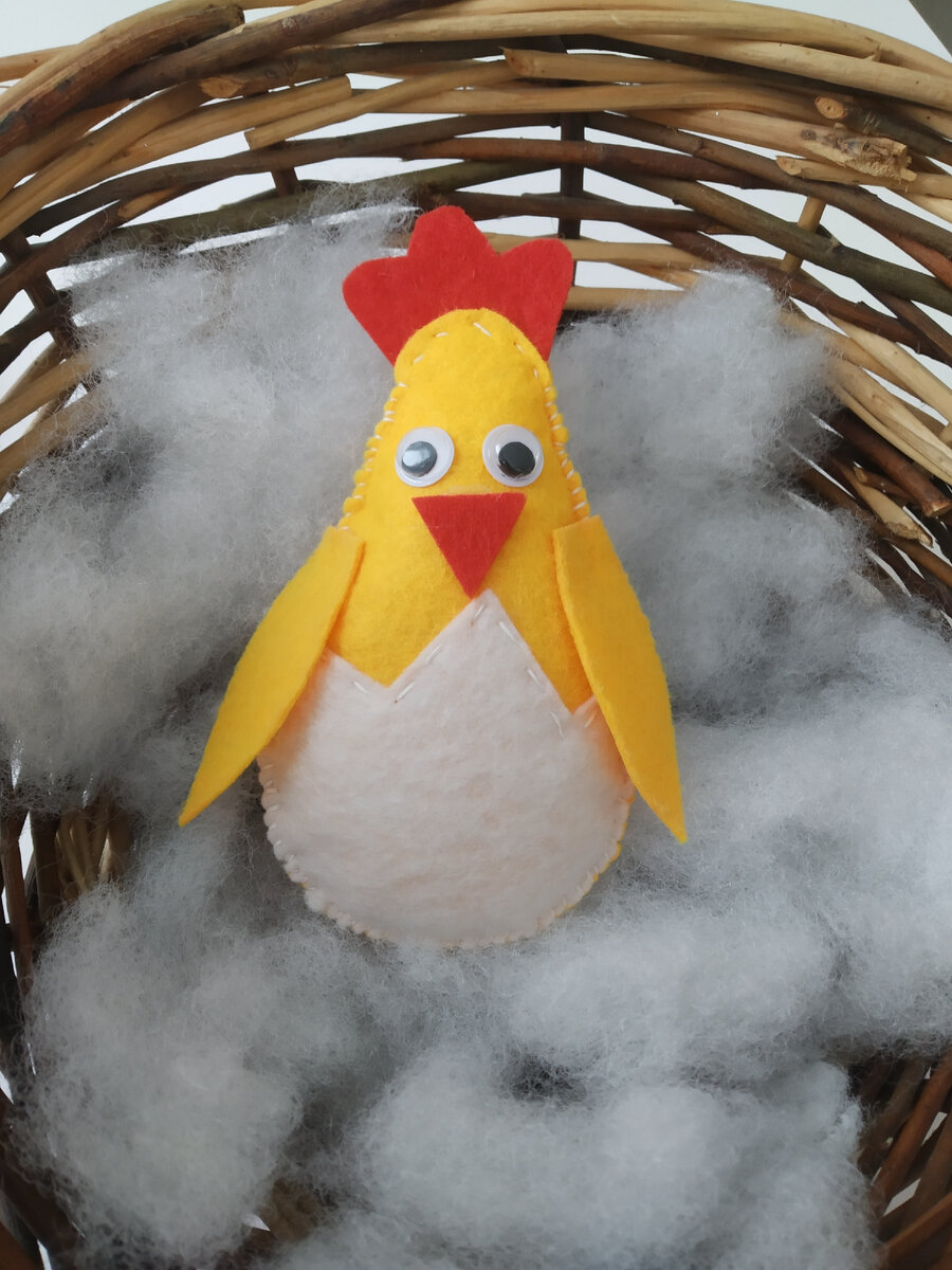 *шьём из фетра (5+) Вам понадобится: -фетр (жёлтый, белый, красный); -нитки жёлтого или белого цвета; -наполнитель; -мелок, иголка, ножницы; -глазки (1 пара); -трафареты из картона (для обводки деталей на фетр); -клеевой пистолет. На фетр жёлтого цвета переводим трафарет ТЕЛО (2 дет.), КРЫЛЬЯ (2дет.), на белый фетр переводим трафарет ЯЙЦО (1дет.) На фетр красного цвета переводим ГРЕБЕНЬ (1дет.) и КЛЮВ (1дет.) Вырезаем детали. Соединяем деталь ТЕЛО с деталью ЯЙЦО. Сшиваем их вместе (делаем стежки только по зубчатому краю). Берём 2 часть трафарета (ТЕЛО) и складываем вместе. Сшиваем трафареты друг с другом , двигаясь по краю к ГРЕБНЮ. Подставляем ГРЕБЕНЬ между деталями (ТЕЛО 1 и ТЕЛО 2). Прошиваем. Когда ГРЕБЕНЬ вшит, делаем остановку, для того, чтобы набить изделие. Набиваем наполнителем и дошиваем изделие до конца. Клеевым пистолетом приклеиваем глазки, клювик, крылья. Всё готово!