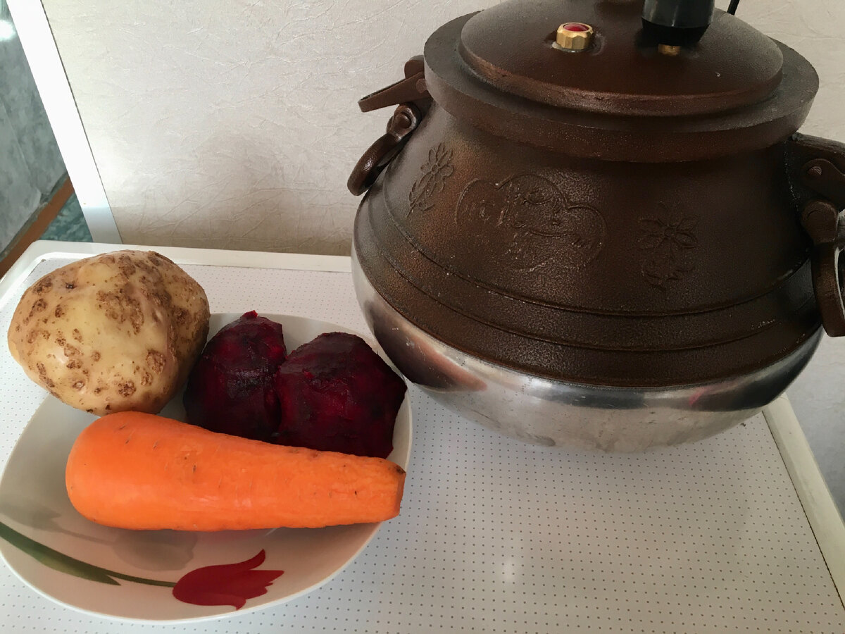 Приготовим быстрый винегрет. Нам понадобится: Сырые овощи хорошо моем железной щёткой, режем пополам, можно и на четвертинки. Кладём в автоклав и заливаем водой так, чтобы она покрывала все овощи. Закрываем казан и варим после свиста на медленном огне около 20-25 минут, зависит от размера овощей, чем мельче порезано, тем меньше времени понадобится для варки. Быстрее только в микроволновке! Но я люблю именно варёные овощи. Овощи прекрасно сварились! Осталось только остудить и нарезать с остальными ингредиентами. Заправить все растительным маслом и вкусно покушать! Приятного аппетита!😋