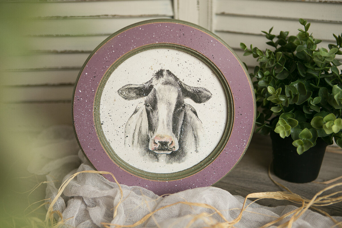 Для этого панно я выбрала круглую заготовку с широкой рамкой от yadecorshop.ru и салфетку с коровушкой, которую купила в Леонардо. Кроме этого нам понадобится: - Клей для декупажа; - Краски акриловые: белая, черная, оливковая и лавандовая; - Лак акриловый матовый; - Резиновый валик или шпатель; - Канцелярский файл; - Пульверизатор с водой - Наждачная бумага №320 - Кисть художественная синтетика плоская: 20 мм и 10 мм - Старая зубная щетка или жесткая кисть (щетина) - Клей Момент монтаж Жидкий гвозди прозрачный. Заготовка из МДФ, его не надо грунтовать, можно сразу приступать к работе. Область под картинку я покрыла белой краской и просушила. Затем приклеила салфетку методом файла – этот метод мой самый любимый и простой. Подробно я его описала в этой статье. Пока салфетка сохла, я окрасила рамку. Плоскую часть покрыла оттенком Вереск, а фаски - оттенком Хаки. Использовала краски от фирмы Таир. После того, как краски высохли, я склеила панно клеем Момент Монтаж жидкие гвозди и окрасила