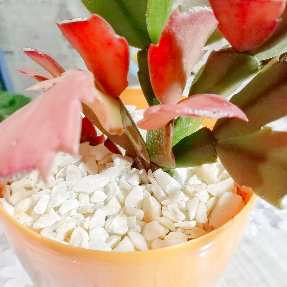 При пересадке своих суккулентов, я замульчировала грунт белой мраморной крошкой. Получилось очень красиво. Белый цвет придает более декоративный вид растениям. На самом деле мраморную крошку в декоративных целях красят в разные цвета. У меня была давно куплена белая, не крашенная. Мульча разного рода, не так часто применяется цветоводами для домашних растений. Это, можно так сказать, новые веяния в комнатном цветоводстве. Небольшой слой мульчи (в зависимости от размера фракции 0,5-1,5см) в цветочном горшке защищает почву от некоторых негативных факторов: - предотвращает уплотнение грунта в цветочном горшке; - не позволяет быстро пересыхать грунту; - препятствует образованию корки на поверхности грунта. Но давайте вернемся, именно, к мраморной крошке. Есть здесь и негативная сторона. Избыток кальция в мраморной крошке может привести к повышению кислотности почвы. А это уже плохо скажется на росте растений. Избыток кальция в грунте приводит к вымыванию из нее железа, которое необходимо д