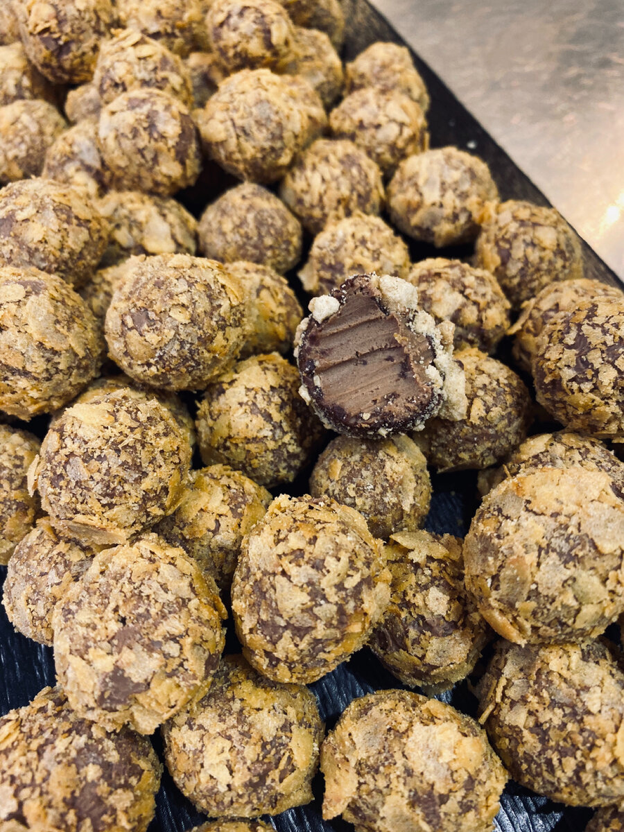70 гр молоко 30 гр сироп глюкозы 185 гр молочный шоколад 40 гр какао-масло 55 гр арахисовая паста Молоко нагреть с сиропом глюкозы до 40°С. Шоколад растопить с какао-маслом и добавить арахисовую пасту. Сделать эмульсию блендером. Переложить готовый ганаш в контейнер, накрыть пленкой в контакт, оставить созревать при температуре 16-18°С минимум на 12 часов. Скатать шарики, дать постоять, обвалять в темперированном темном (или молочном) шоколаде, а затем в вафельной крошке.