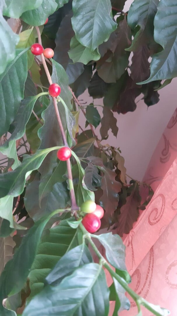 Цветет кофе небольшими цветочками с нежным и изящным ароматом. Вызревают плоды в течение долгих 9 месяцев. Поначалу горошины имеют зеленоватый цвет. Позже они становятся темно-бордовыми. Созревшие ягоды напоминают мелкую черешню. Их мякоть съедобная, на вкус сладковатая. Внутри ягодки прячутся два светло-зеленых зерна.