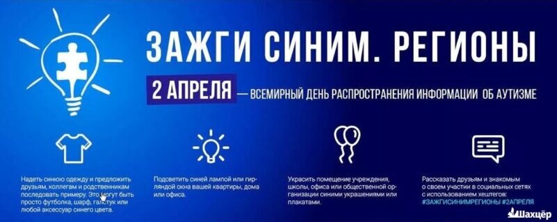 2 апреля ежегодно проходит Всемирный день распространения информации о проблеме аутизма. Он был установлен резолюцией Генеральной Ассамблеи ООН, в которой была выражена обеспокоенность высокой численностью детей, страдающих аутизмом. Государственное учреждение образования «Солигорский районный ЦКРОиР» 01.04.2022 проводит акцию «Зажги синим», посвященную Всемирному дню распространения информации о проблеме аутизма с целью формирования толерантного отношения к детям с расстройствами аутистического спектра. Также целью данной акции является привлечение внимания общественности к проблеме детей с аутизмом и их семьям. Синий цвет - официальный цвет акции. Участниками акции «Зажги синим» являются учащиеся, воспитанники, педагоги учреждений дошкольного и общего среднего образования. 01.04.2022 в рамках акции в учреждениях общего среднего образования, учреждениях дошкольного образования будут проведены мероприятия посвященные проблеме аутизма: информационные часы; просмотр художественных фильмо
