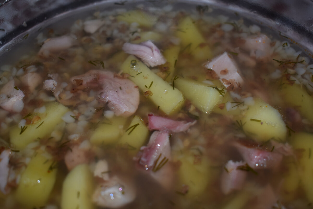 Быстро и вкусно готовим обед.Гречневый супчик с копченым окорочком.Кастрюлька супа на 8 человек.Не дорого и очень вкусно. Приступаем к готовке.Начинаем из заготовок. Насыщенный и легкий и без зажарки Гречневый суп на обед. Кастрюлю с водой и копченым окорочком ставим на плиту на средний огонь и доводим до кипения и варим на медленном огне примерно 8 минут.Нам нужно,чтобы окорочок отдал свой запах и вкус копчености. Картошку почистить и помыть. у меня ушло 7 картошин среднего размера,нарезаем соломкой. Заливаем холодной водой и пока убираем в сторону,мы пока подготавливаем все продукты для супа,пока варится окорочок. Берем гречневую крупу и хорошо промываем и сливаем воду. Гречневую крупу помыли,убираем пока в сторону. Достаем окорочок из кипятка и даем ему полностью остыть.Будем убирать шкурку и отделять мясо от кости. Пока окорочок остывает.Выкладываем в кастрюлю нарезанный картофель и промытую гречневую крупу. Варим на среднем огне до закипания,затем уменьшаем огонь на миниму и варим