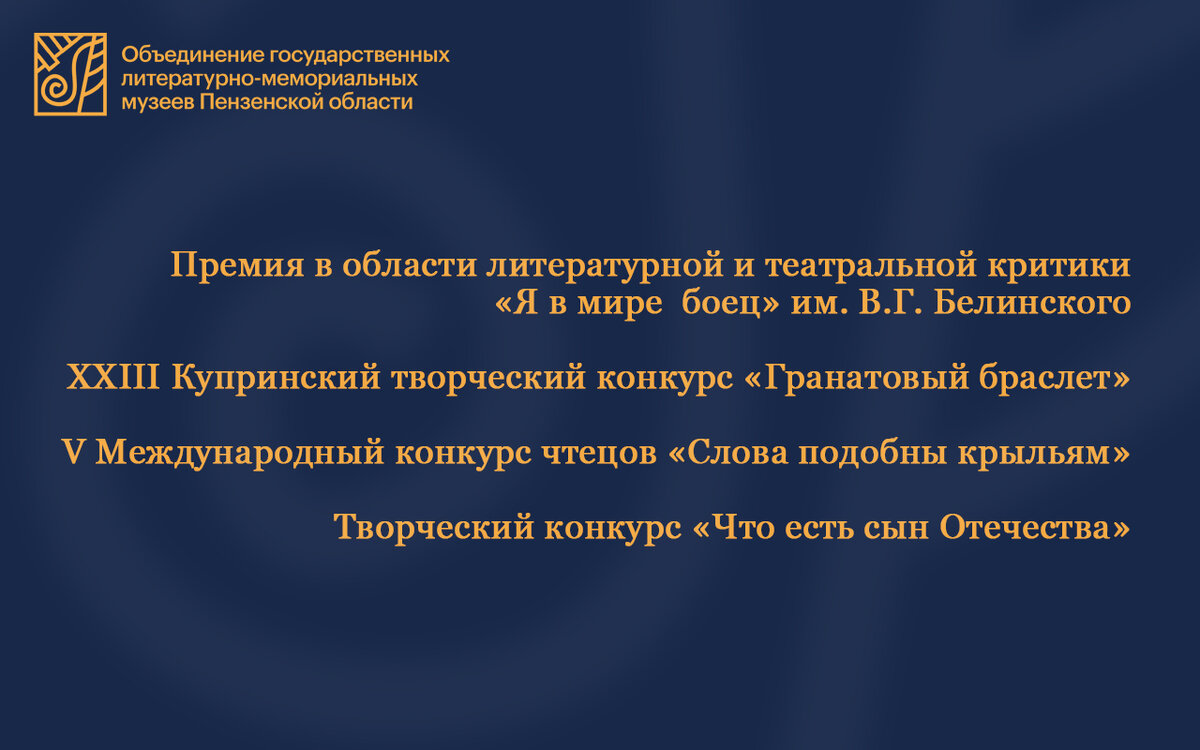 Весной 2022 года стартовали сразу четыре конкурса, объявленных Объединением государственных-литературно-мемориальных музеев Пензенской области при поддержке Министерства культуры и туризма Пензенской области. Эти творческие состязания проводятся ежегодно уже несколько лет подряд. Самый авторитетный из них состоится в 23 раз. Конкурсы рассчитаны на участников разных возрастов — от 6 лет и старше. Творческим людям предлагают продемонстрировать писательские способности, посоревноваться в умении декламировать художественные произведения, анализировать литературные сочинения и театральные постановки. XXIII КУПРИНСКИЙ ТВОРЧЕСКИЙ КОНКУРС «ГРАНАТОВЫЙ БРАСЛЕТ» призван популяризировать богатое литературное наследие выдающегося русского писателя-земляка А.И. Куприна и привлечь внимание общественности к творчеству писателя и ежегодному Купринскому литературному празднику, способствующему развитию событийного туризма в Пензенской области. В конкурсе традиционно заявлены две номинации, в одной из ко