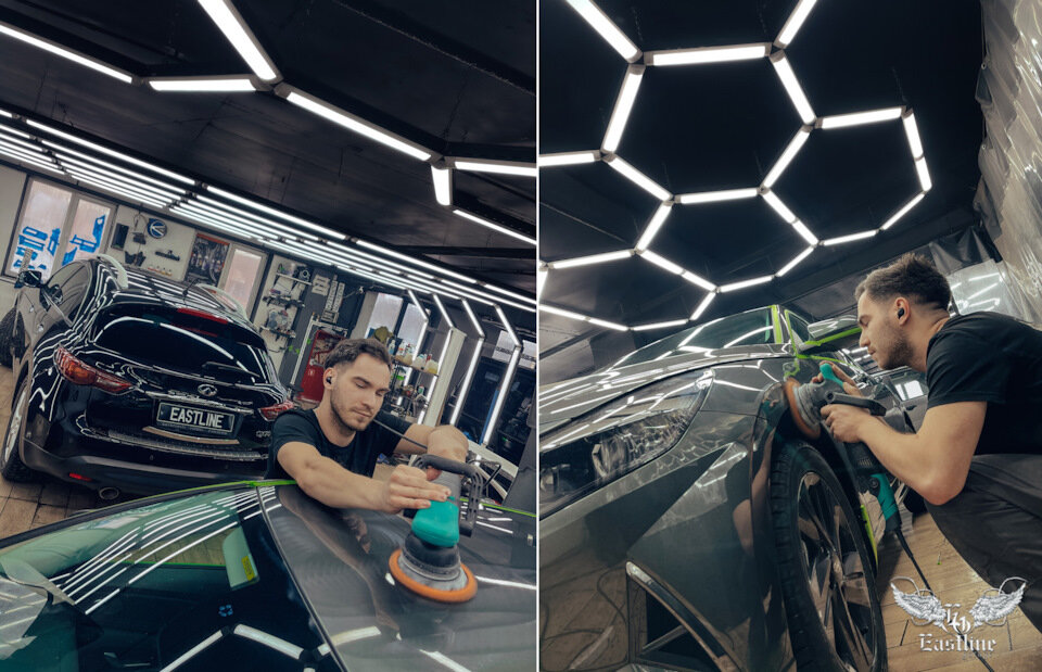 Сегодня на очереди у нас новенький автомобиль — Hyundai Elantra 2022 года. Казалось бы, зачем новому автомобилю посещать тюнинг-ателье? Все просто: владелец автомобиля — крайне предусмотрительный человек, который принял правильное решение: проще предотвратить, чем потом исправлять "косяки", появившиеся за время эксплуатации. После первого этапа — мойки высокого давления, за дело берутся мастера-детейлеры EastlineGarage. При помощи ручной мойки с применением специальных шампуней и щёток они доводят кузов автомобиля до чистейшего состояния. Вот теперь кузов полностью избавлен от въевшихся пятен и сложных статических загрязнений, поэтому можно приступать к процессу полировки. Нанесение на кузов защитных керамических составов производится поэтапно, где первыми обработке подверглись все металлические крашеные элементы. Керамика, которую мы использовали для данного вида работ — Meguiar's M688 Deep Chrystal Ultra Paint Coating. Состав не просто защищает элементы кузова от разного рода механич