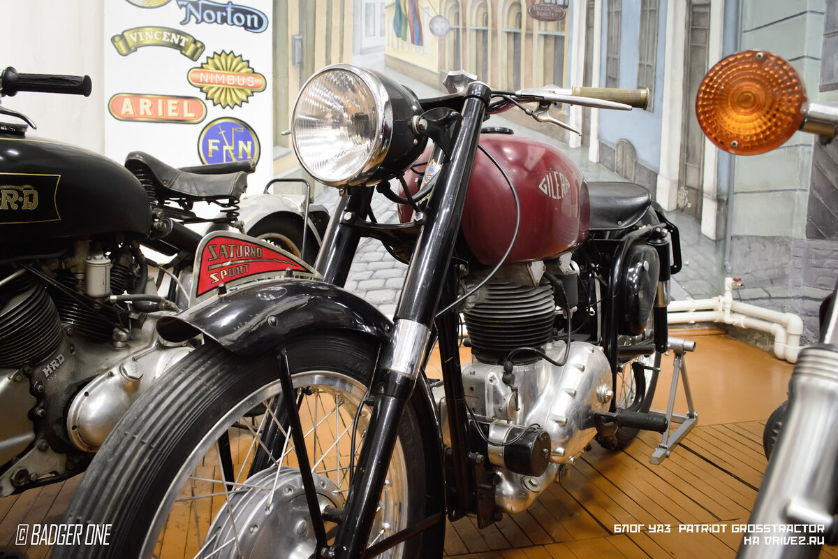 Сразу за Vincent HRD Rapid B стоит итальянский красавец Gilera Saturno Sport 1955 года выпуска. Модель Saturno выпускалась с 1948 по 1956 годы в исполнениях Turismo, Sport, Competizione и Corsa. В 1953 году к ним добавились версии Cross и Regolarita. Все мотоциклы оснащались одноцилиндровым четырёхтактным двигателем объемом 500 кубиков и мощностью 22 л.с. Представленная в музее версия Sport была немного легче остальных за счет использования алюминиевых деталей и могла достигать скорости до 175 км/час.