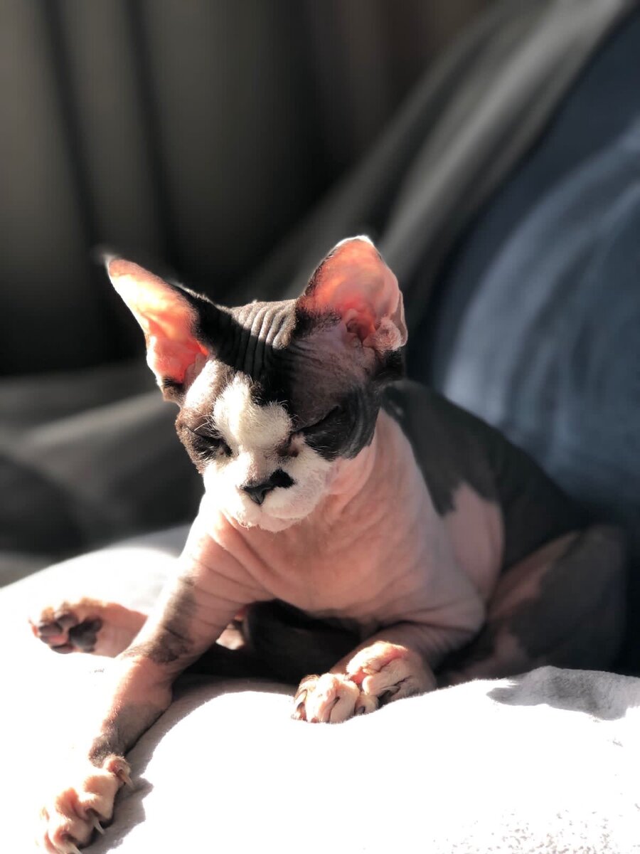 Всё началось в далеком 2012 году, когда подруга попросила нас забрать её с котенком от заводчицы. Она искала себе именно эту породу, так как на шерсть у нее была аллергия и лысая кошка была решением. Мы приехали помочь, и по пути до дома мне дали подержать в руках маленькое чудо, которое было не более 10 сантиметров в длину, а весило не тяжелее смартфона. Никогда не забуду это ощущение, это что-то максимально теплое, нежное, мягкое, будто ты держишь на руках младенца, а по ответственности- будто тебе доверили дотронуться голыми руками до органа, который ожидает своей трансплантации (соглашусь, странное сравнение, но я же о своих ощущениях..)