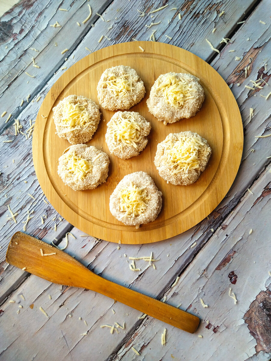 🧀Куринные гнезда с сыром. 🧀 Осталось филе грудки, приготовлю полуфабрикат. Получается очень вкусно Куриное филе-500 гр. Лук-1шт. Сыр -70гр Специи-1ч.л Майонез-1ст.л. Яицо сырое-1шт. Панировка на глаз. Я измельчаю в блендере, поэтому почти всё ингредиенты собираю сразу. Филе, лук, соль, специи и яйцо и майонез отправляю в измельчитель , довожу до однородного состояния. Из получившейся массы формируем котлеты. Обваливаем в панировке. В середине делаем углубления, в него накладываем сыр(натертый на мелкой терке) . 🟥 Укладываем полуфабрикаты на разделочную доску, обернутую пищевой плёнкой, отравляем на заморозку. После того как замёрзнут можно сложить в пакет. 🟥Если собираетесь сразу готовить. Разогреваем духовку. Выпекаем при 200 С 20-25 минут.