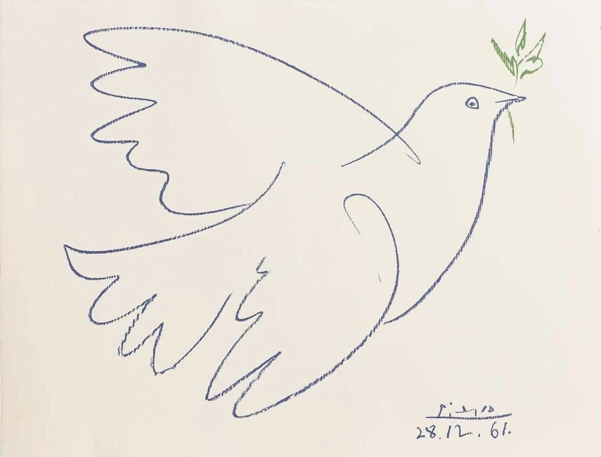 Одно из самых сильных визуальных высказываний в истории искусства — масштабное полотно «Герника», созданное в мае 1937 года и посвященное ужасам и трагизму войны. Наиболее узнаваемое графическое изображение XX века — белая голубка с оливковой веткой в клюве, символизирующая мир. Объединяет эти две художественные работы не только сильная антивоенная идея, лежащая в их основе, но и автор: Пабло Пикассо. Рисунок с голубкой культового франко-испанского художника обрел свою славу в середине XX века в качестве эмблемы Всемирного конгресса сторонников мира. Даже спустя десятилетия «Голубка» и ее лаконичный символизм не потеряли своей актуальности: сегодня мы вспоминаем историю создания этой знаковой работы Пикассо.