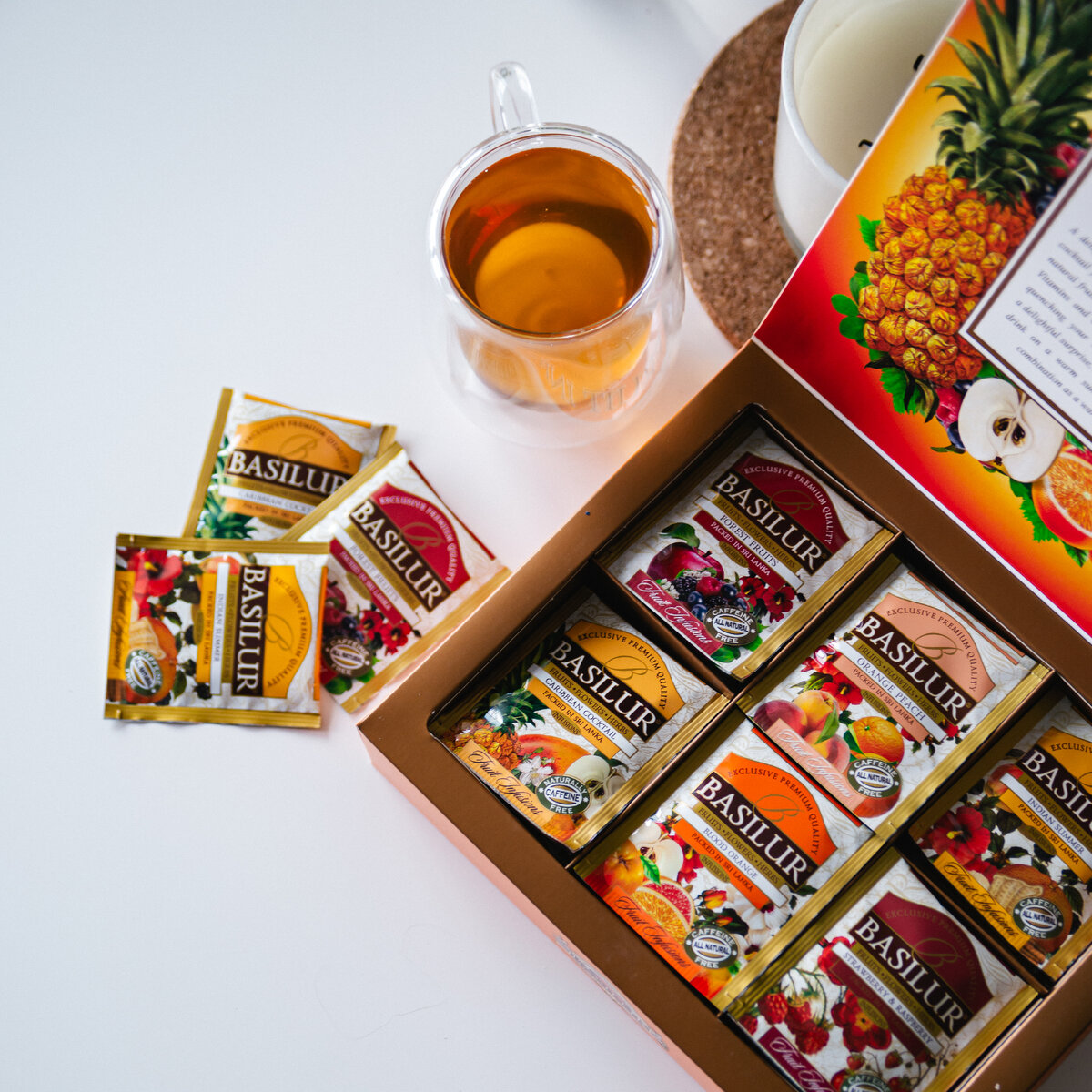 В коробке 40 пакетиков в индивидуальных саше. Напомним, у цейлонского Базилура пакетированный чай не уступает рассыпному. 4 разных вкуса, созданных с