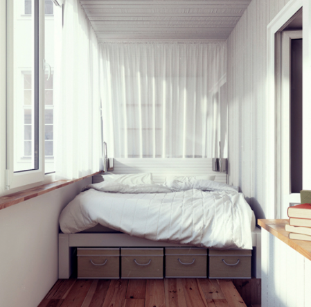 Прежде чем планировать устройство спальни на балконе, оцените его размеры. Большое значение имеет длина, потому как на нем должна поместиться как минимум кровать. Технически, спальня на балконе возможна, если он не менее 2 м в длину. Кроме спальни, на небольшом балконе можно создать место для отдыха, чтения, работы, детскую комнату или кабинет.