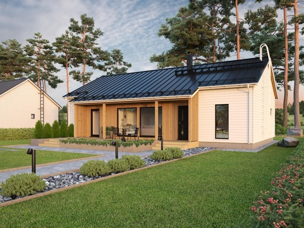 Модель компактного дома, предусматривающая три спальни. В его особенности входят большие окна и современная терраса.