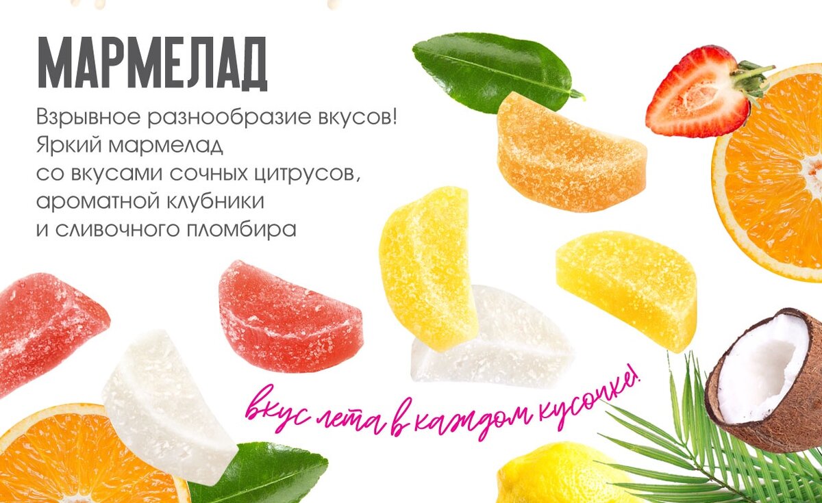 Взрывное разнообразие вкусов! Яркий мармелад со вкусами сочных цитрусов, ароматной клубники и сливочного пломбира. Вкус лета в каждом кусочке! Желирующий природный компонент «агар» делает мармелад поистине нежным и полезным лакомством. Начнем с того, что агар обладает нулевой калорийностью, а потому является очень востребованным для диетического питания. Все же хотят кушать сладости и оставаться в форме? Наш мармелад – то самое лакомство! К тому же, агар богат магнием и железом, а также клетчаткой. Мармелад от Кондитерской фабрики «Дымка» имеет в составе пюре яблочное, пюре клубничное, пюре апельсиновое, поэтому у него сочный, яркий и выразительный вкус! Мармеладки можно употреблять как самостоятельный десерт, так и для украшения различных кондитерских изделий! Делимся с вами интересными фактами о мармеладе: Где удобно и быстро купить Клубничный, Апельсиновый, Лимонный, а также со вкусом сливочного пломбира Мармелад? Конечно, на сайте Дымка.рф.