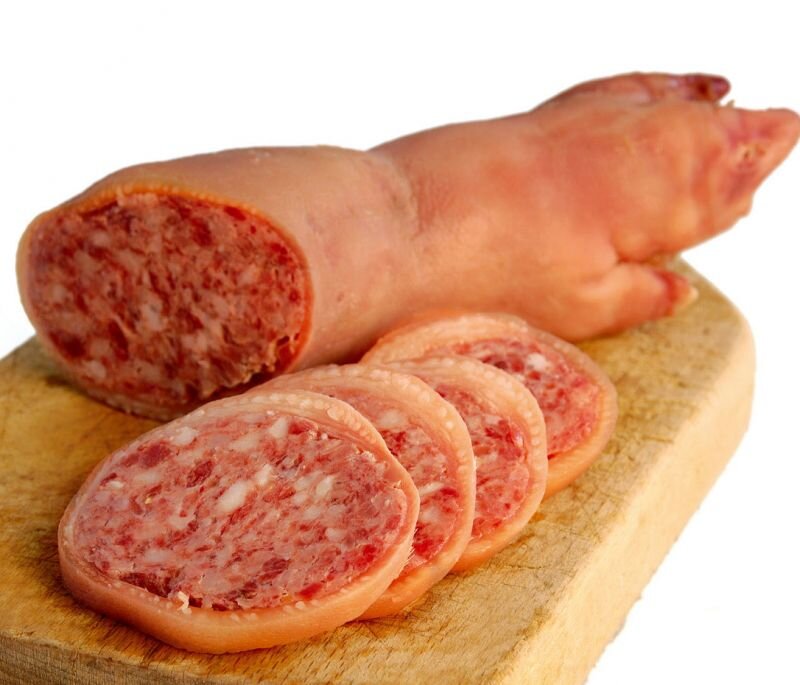 Старинное мясное блюдо итальянской кухни - фаршированные свиные ножки или колбасное изделие в оболочке из кожи свиной ножки с копытцем. Несмотря на неказистый вид и дешевизну ингредиентов, нежный, пряный и студенистый дзампоне является популярным по всей стране сезонным блюдом и обязательно присутствует на праздничных столах итальянцев начиная с Рождества, в новогоднюю ночь и до Дня трёх волхвов. Популярность дзампоне в качестве новогоднего блюда в Италии объясняется тем, что свинья по поверью приносит удачу. Похожие по принципу приготовления блюда, фаршированием субпродуктов, есть, например, в немецкой кухне и в русской кухне. Ингредиенты Пошаговый рецепт приготовления У свиной ножки аккуратно подрежьте кожу в 35–40 см от копыта. Снимите кожу чулком. Отделите кость вместе с оставшейся на ней мякотью. Внутри кожи должно остаться немного костей на самом копытце. Добавьте в фарш горчицу, тимьян, черный перец, белый перец, морскую соль, мускатный орех, сахар, майоран, цедру. Подготовленн