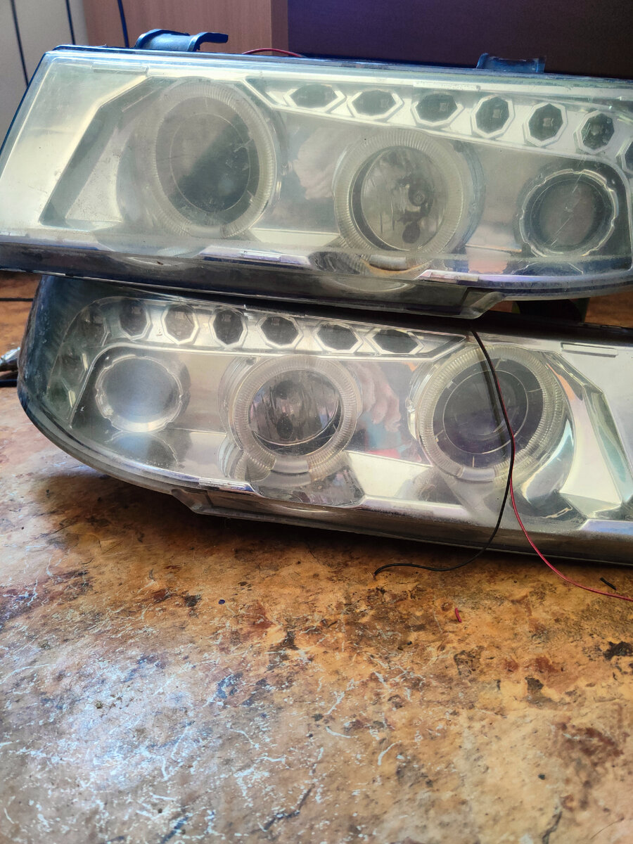 Вот попали мне в руки такие вот чудо фары.... Но не без косяков. Путём проверки выяснилось что не работает один глаз... Ангельский... Делать было не чего,пришлось расклеивать Путём рытья в инете понял,что надо греть,но из фенов в доме был только у жены Выбора у неё не было,поделилась на вечер. И так,из инструмента нам требуется Фен,нож(самое главное-не острый). И линейка металлическая) Греем феном шов,вставляем нож. Двигаем нож вместе с феном (фару можно закрепить как угодно,я держал просто на коленях). Прошли половину фары-вставили линейку. Греем вторую половину и можно расклеивать. Теперь задача вытащить сам "глаз". Держится он на трёх защёлках. Отодвигаем отражатель фары максимально назад и пальчиками нажимаем на защёлки Снимаем сам глаз и понимаем что сдохли диоды. Высверливаем их оттуда сверлом 4,5мм И впаиваем другие И вуаля) Главное соблюсти полярность диодов,и за герметизировать. Сборку пока не проводил) Как проведу выйдет следующий пост))))