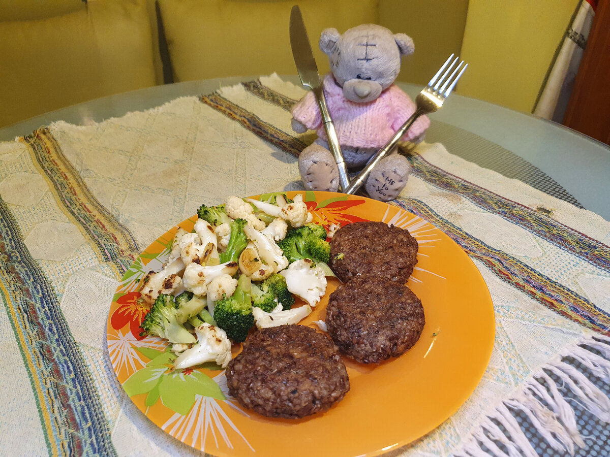 Сегодня на ужин рисовые котлетки и много-много овощей. Без лишних слов приступим. Ингредиенты на 2 порции: рис 80г, яйца 1шт, мука 2ст.л, прованские травы, перец. Рис (у меня в этот раз красный) промыть и отварить по инструкции или приготовить способом, о котором я писала в одной из своих статей тут: В остывший рис вбить яйцо. Для вегетарианского варианта куриное яйцо можно заменить льняным (если нужна инструкция как сделать такое – пишите в комментариях). Приправить рис специями и пробить погружным блендером. До однородности не доводить, достаточно, чтобы все ингредиенты подружились, и масса стала липковатой. Муку добавить только в случае недостаточно густой консистенции. Для более интересного вкуса можно добавить в массу пару ложек тертого сыра. Сформировать котлетки влажными руками или ложкой и обвалять в муке (в идеале рисовой) или отрубях – но это необязательно. Обжарить наших рисовых друзей с двух сторон на сильно разогретой сковороде с малым количеством масла или без такового, е