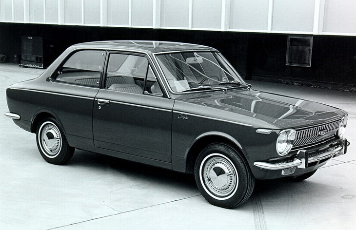 Тойота Королла • 1 поколение (Е10) • 1966–1970 Первая Toyota Corolla была представлена в Японии в октябре 1966 года — это был маленький, длиной всего 3,85 м, заднеприводный двухдверный седан. Четырехцилиндровый двигатель объемом 1,1 литра развивал 60 л. с., коробка передач была четырехступенчатой, задняя подвеска — рессорной зависимой, а передняя — независимой с одной поперечной рессорой (позже пружинной). В мае 1967 года появились модификация с четырехдверным кузовом, а также трехдверный универсал. Еще через год в продажу поступило купе Corolla Sprinter. Тогда же начались продажи в США.