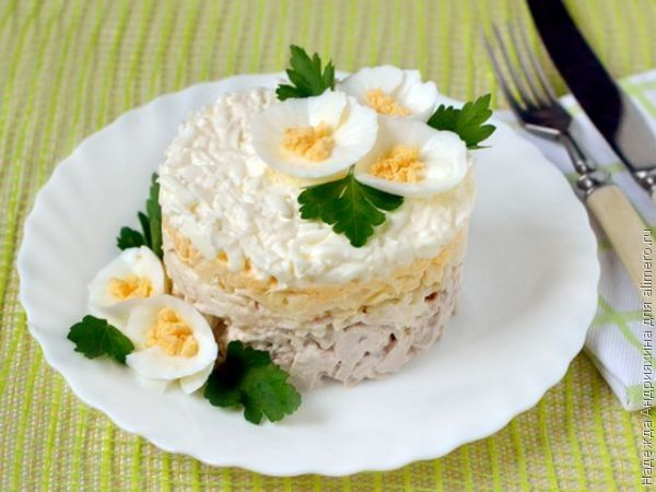 500 г куриного филе, 3 яблока, 3 яйца, 200 мл майонеза, 100 мл оливкового масла, соль. Куриное филе обжарить в горячем оливковом масле до образования золотистой корочки, остудить и мелко нарезать. Яйца сварить вкрутую, остудить, очистить и мелко порубить. Яблоки вымыть, очистить от кожицы и семян и натереть на крупной или средней терке. Все ингредиенты соединить, заправить майонезом, перемешать.