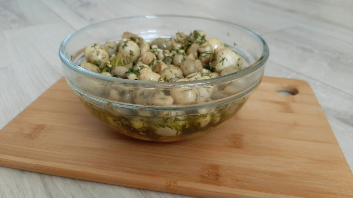 Пожалуй нет такого человека, который не любит маринованные грибочки! А если вы думаете, что их приготовление это сложный процесс, то я вам сейчас расскажу насколько это просто и быстро! Для приготовления нам понадобится. 1 шампиньоны 600 г. 2. Пучок укропа. 3. Чеснок 1/2 головки. 4. Вода 300 мл 5. Уксус 9% 2 ст.л. 6. Растительное масло 100 мл. 7. Хмели-сунели 1ч. л. 8. Соль 1 ч.л. 9 лавровый лист 2 шт. Для начала ,грибы шампиньоны нужно почистить и хорошо промыть водой. Если грибы крупные, то их нужно порезать .В кастрюлю наливают воду, отправляем туда все подготовленные грибы и ставим на огонь отвори ваться в течение 10 минут. Пока грибы будут отвариваться займёмся маринадом. Пучок укропа и чеснок нужно мелко порезать. Порезанный укроп с чесноком перекладываем в ёмкость где будем мариновать грибы. К нему добавляем растительное масло, уксус, соль, лавровый лист растираем руками, добавляем ложку хмели-сунели и тщательно всё перемешиваем. После того как грибы поварятся 10 минут, пр