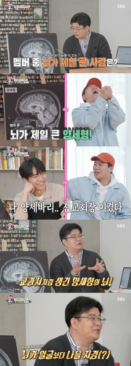 Yang Se-hyung was chosen as the person with the biggest brain among the members. In the SBS entertainment program 'All The Butlers', which was broadcast on the afternoon of the 27th, I visited the house of Korea's best brain scientist, KAIST professor Jeong Jae-seung. Before meeting with Jung Jae-seung, the members had brain MRI scans, and based on this, Jung Jae-seung selected and announced the person with the largest brain among the members. Prior to the announcement, to Ri-jung's question whether a big brain is smart, Jeong Jae-seung answered yes, and the members began to stir. Jung Jae-seung said, "Normally, people with large faces have a higher chance of having a large brain." Compared to other normal animals, this is not the case. Whales and elephants have bigger brains than humans.” Jaeseung Jeong also said, “How about comparing the same species? Men's brains are larger than women's, but their intelligence is similar. So, when comparing men and women together, brain size do