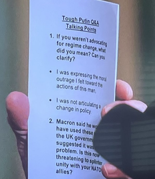 Президенту США Джо Байдену составили шпаргалку для общения с представителями СМИ. Это стало известно после публикации агентства Reuters в соцсетях. На фотографии пользователи Сети заметили заранее прописанные ответы на ряд вопросов, который касался президента России Владимира Путина. В Сети массово репостят подсказки Байдену с вопросами и ответами, составленные Белым домом для разъяснений его нашумевшего заявления о Путине. Детали в РИА Новости: США.