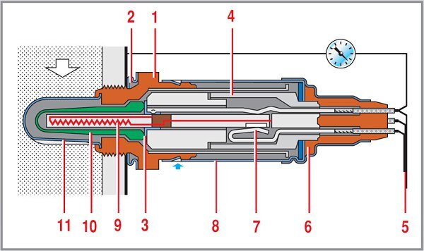 11) защитный экран с отверстием для отработавших газов. Большинство автомобилей, выпущенных с 1998 года оснащаются минимум двумя (некоторые, особенно с V-образным двигателем — четырьмя) кислородными датчиками. Это означает, что автомобиль соответствует экологическому классу ЕВРО-3, 4, 5 или 6. Верхний лямбда-зонд отслеживает остаток кислорода в выхлопных газах и корректируют подачу топливовоздушной смеси — он не участвует в работе катализатора. Второй датчик находится после катализатора и считывает показания выхлопных газов, прошедших через него. Электронный блок управления сравнивает его показания с первым датчик