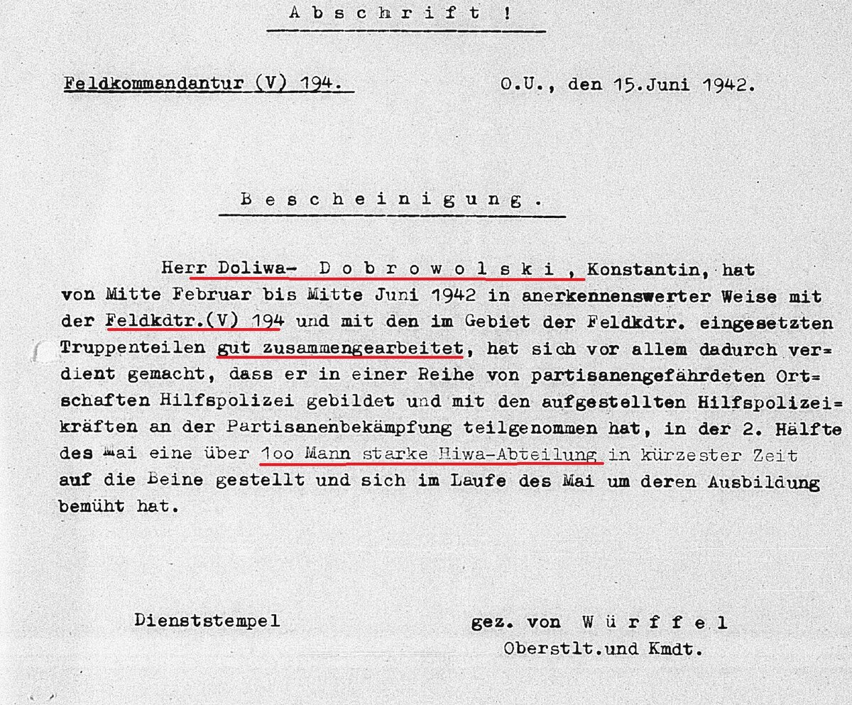 Цитируем статью дальше: «На новой работе К.А. Добровольский развил кипучую деятельность. Пользуясь тем, что оккупационный режим еще не сложился, а инструкции ему были даны довольно расплывчатые, бывший капитан для начала распространил свое влияние далеко за пределы Сосниц. К декабрю 1941 года его полицейский отряд действовал в Батурине, Коропе, Корюковке, Сновске, Нежине и других городах, и поселках. Огорчу: отряда у него на тот момент не было. Он возглавлял вспомогательную полицию (дубиночную), которая, по всем документам, оружия не имела. Ее вооружали комендатуры (в данном случае мадьярская комендатура) в том случае, когда она привлекалась для каких либо действий. Оружия тогда полицаям не доверяли (кроме плановых операций).
