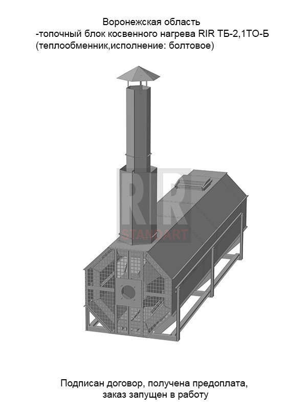 Завершены переговоры, подписан договор, получена предоплата о поставке топочного блока косвенного нагрева теплоносителя RiR ТБ-2,1ТО-Б (теплообменник, исполнение болтовое) в Воронежскую область. Заказ запущен в работу. Состав заказа: - топочный блок косвенного нагрева теплоносителя RiR ТБ-2,1ТО-Б (теплообменник, исполнение болтовое) Топочный блок будет работать в составе колонковой зерносушилки. Специалисты завода RiR-standart приступили к заготовительным операциям.