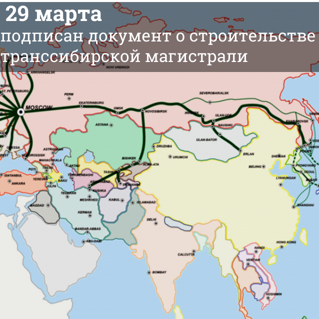 ● Транссибирская магистраль - самый большой в мире железнодорожный путь, проходящий по двум частям свет. Эта дорога соединяет Москву и европейскую часть России с крупнейшими городами дальнего востока, её общая длина составляет 9298 км. ● Строительство началось 19 мая 1891 в Владивостоке, интересно то, что на открытии присутствовал будущий император Николай II. На строительство дороги был необходим огромный запас рабочей силы и специалистов. 1895‑1896 годы численность рабочих составляла около 85 тысяч человек. 18 октября 1916 года строительство транссибирской магистрали было полностью завершено. ● Результатом строительства транссибирской магистрали стала возможность впервые в истории следовать пассажирским поездам только по рельсам, без использования паромных переправ, от берегов Атлантического океана до берегов Тихого океана.