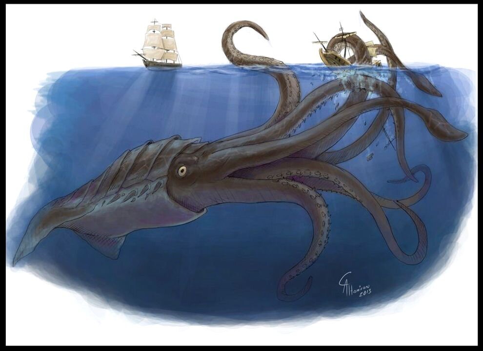 Страшное чудовище, неожиданно вынырнув из моря, наваливается на лодку и стягивает моряков в темную глубину. Такая история легла в основу многих легенд, дошедших до нас с прошлых веков. Но существуют ли морские великаны? Однажды в море Росса, что в Антарктике, рыбаки случайно поймали огромного кальмара, который называется исполинский антарктический. Он, вместе со щупальцами, был примерно 10 метров длиной и весил около 500 килограммов. Правда, ученые считают, что этот вид кальмара может достигать и больших размеров. Еще одним морским великаном является гигантский кальмар. Он похож на торпеду, имеет глаза величиной с человеческую голову и клюв словно у попугая, которым может перекусить металлический кабель. У этого кальмара восемь конечностей с рядами присосок и два длинных щупальца, которыми он подносит в свой рот пищу. Гигантский кальмар способен двигаться под водой со скоростью 30 км в час и даже выпрыгивать из воды. Таких кальмаров видели в течение прошлого века менее 50 раз, и их ник