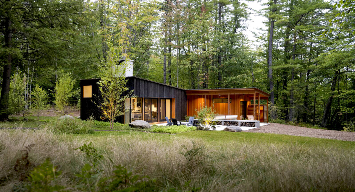 Как правило, именно архитекторы и дизайнеры подкидывают своим клиентам идеи для строительства дома. Но в этой истории все случилось как раз наоборот. Заказчики познакомили архитекторов с японской философией ваби-саби, приверженцами которой они являются. Ваби-саби – это изящество простоты, умение во всем видеть красоту и находить меру в удовольствии от материальных благ и свободой от привязанности к ним. Участок расположен в лесной зоне в Нью-Гэмпшире, на берегу красивого озера Лун. Супруги хотели, чтобы в коттедже были и комнаты, залитые солнечным светом, и уютные, затененные зоны. Т-образная постройка может похвастаться длинными коридорами и террасами с навесами, которые создают приятную тень от солнца. В гостиной панорамные окна смотрят на юго-восток и на озеро Лун. С этой стороны всегда много солнечного света. В то время как на противоположной стене есть только небольшие окошки. Через маленькое окошко над бетонной скамьей, примыкающей к камину, можно созерцать величественный лесной