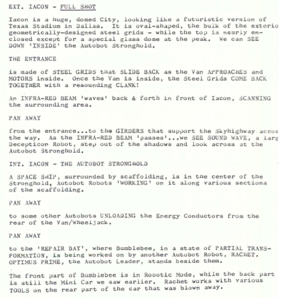 В одной из вырезанных сцен показано, что ворота Аякона защищает инфракрасный сканер. Саундвейв, который в сценарии изображается огромным, просто выходит из темноты рядом с городом. Внутри базы автоботов идёт работа над космическим кораблём, разгрузка Вилджека и ремонт Бамблби. Разведчик наполовину трансформирован, его задняя часть всё ещё в альтмоде, и Ретчет трудится над её починкой. Бамблби жалеет, что им не удалось найти больше стержней, на что стоящий рядом Оптимус отвечает, что, возможно, Джазу (который, как мы знаем из англоязычной версии серии, обследует северные регионы планеты) повезёт больше.