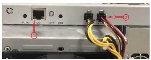 ✓ Включите майнер и подключите сетевой кабель, подключенный к коммутатору (или роутеру). Убедитесь, что индикатор подключения сетевого порта мигает. Если индикатор сетевого порта не горит, это означает, что контрольная панель MM отключена от питания. Затем необходимо проверить, подключен ли кабель питания, заменить блок питания или проверить, нет ли короткого замыкания вывода питания.