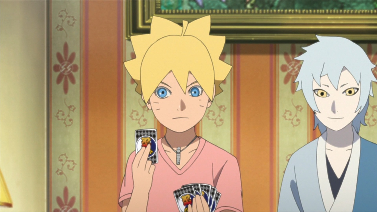 Жизнь Боруто протекает в мире, развитом подобно нашему времени: развитые транспортные коммуникации, современные технологии, приставки и бургеры. Как истинный представитель своего времени Боруто любит как видеоигры, так и настольные. Самые внимательные поклонники смогли заметить, как минимум 2 любимых игры сына Наруто: карточную коллекционную игру «Убойные карты ниндзя» и игру «Поединок шиноби». Игра «Поединок шиноби» - карточная игра, очень похожая на «Уно». Мы взяли на себя смелость и на основе показанных в 27 серии кадрах игры создали игру, максимально приближенную к той, что показана в аниме. Итак, в колоде 109 карт, разделенных на 5 мастей-стихий (огонь, воздух, земля, вода и молния) и S-карты – особые карты для смены мастей. Каждый игрок получает по 6 карт и в свой ход д