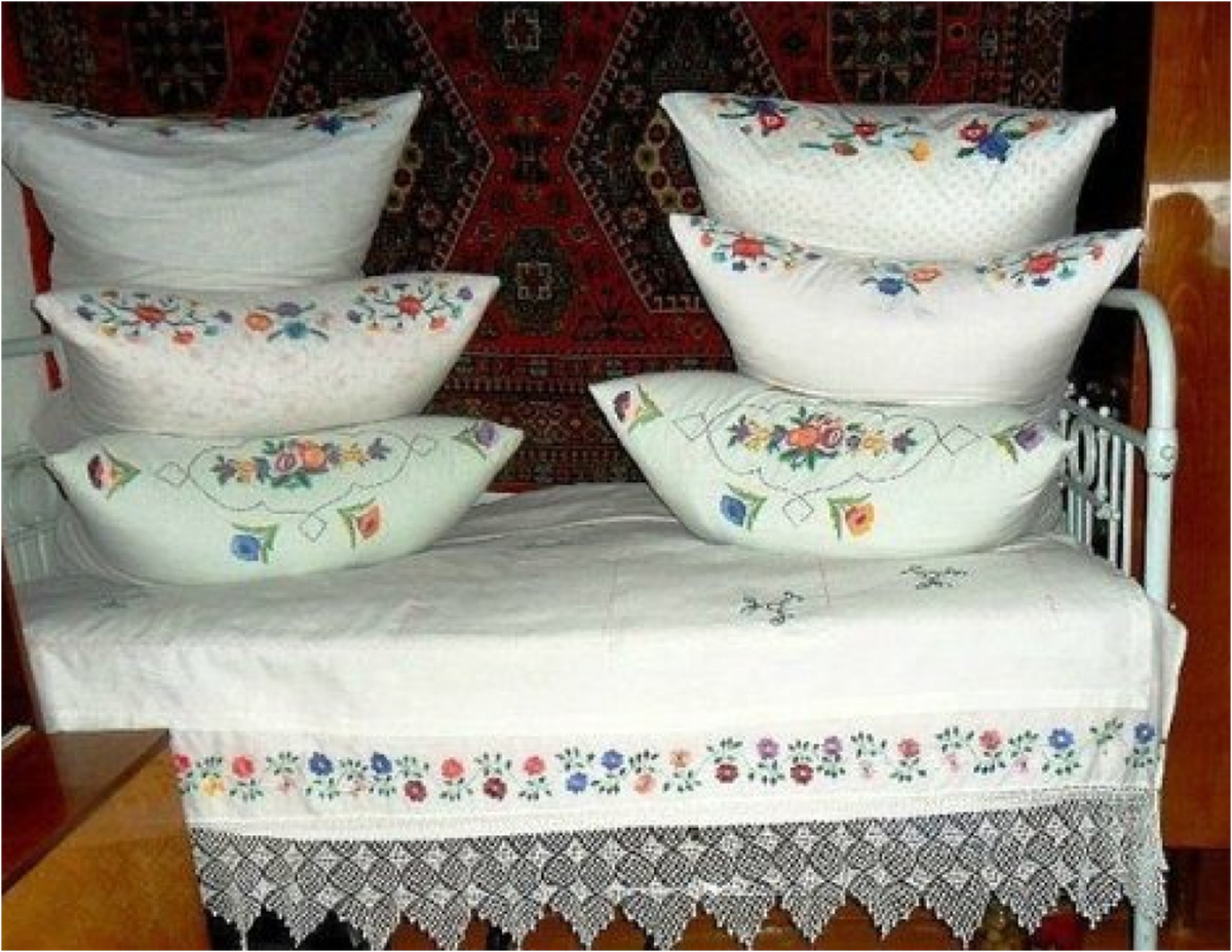 Всё думаю, зачем столько подушек выставляли? Их же надо было каждый вечер половину убирать, потом утром снова заправлять. Ответ пришел недавно. Наравне с коврами пуховые подушки являлись символом богатства и достатка. Поэтому их выставляли напоказ и украшали. А ежедневный ритуал застилания постели задает тон всему дню. Порядок в доме – порядок в голове!