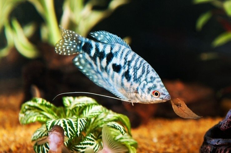 Мраморный Гурами (Trichopodus trichopterus) Обладает оригинальным рисунком тела с комбинацией голубого и тёмно-синего цветов, внешне напоминает прожилки в мраморе. Красивый внешний вид и неприхотливость определили его популярность среди аквариумистов во всём мире. Данный вид является искусственно-выведенной формой Голубого Гурами. Заводчики выборочно выводили нужные признаки и закрепляли их на протяжение нескольких поколений, в результате были получены новые цветовые вариации, среди которых — Золотой и Платиновый Гурами. АРЕАЛ ОБИТАНИЯ: Голубой Гурами выведен искусственно в 70-е годы прошлого века в США, в настоящее время разводится главным образом в Юго-Восточной Азии. В дикой природе не встречается. ОПИСАНИЕ: Рыба средних размеров, имеет удлинённое несколько овальное тело, сжатое с боков. Плавники крупные в сравнении с телом, округлой формы. Брюшные плавники в процессе эволюции видоизменились до нитевидных чувствительных отростков, с помощью которых Гурами изучает окр