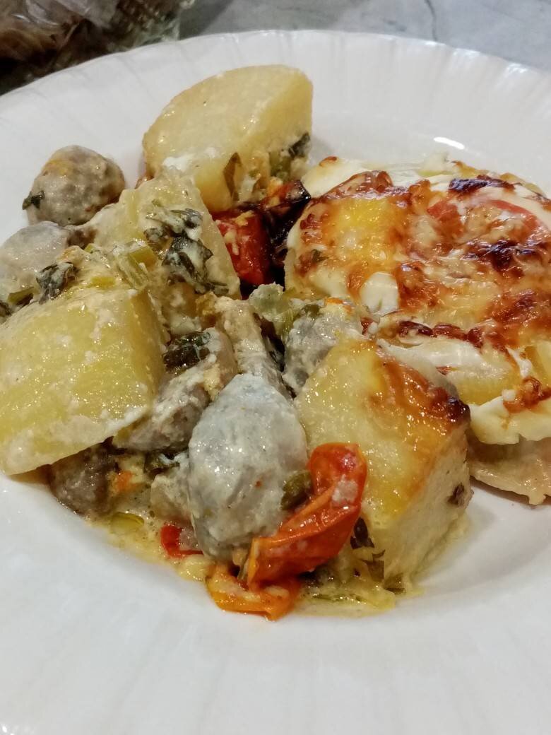 Картофель с шампиньонами в сметане и курочка под ананасом