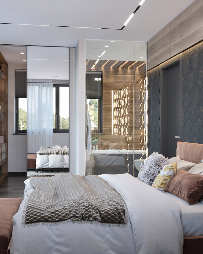 Дом был куплен с предчистовой отделкой и по желанию заказчика мы произвели перепланировку с заменой более 50% коммуникаций. Для каждого члена семьи была спроектирована и выполнена спальная комната с необходимой для комфортной жизни площадью и личным санузлом. А для глав семьи были выполнены “личные уголки”: кабинет для хозяина в стиле милитари и кухня для хозяйки, совмещенная с большой гостиной комнатой для большего удобства проведения времени. В последнее время всё больше популярности приобретают гардеробные комнаты из-за удобства хранения и доступности вещей хранящихся в них. Соответственно, нами был выполнен и гардеробы с удобным расположением в каждой спальне. При проектировании и выборе материалов мы отдали предпочтение ярким оттенкам красок, современным инженерным конструкциям и многоуровневым потолкам с трековым встроенным светом. Также в доме был выполнен банный комплекс с зоной СПА. Большим плюсом в проекте данного дома оказалась выполненная нами приватная зона отдыха д