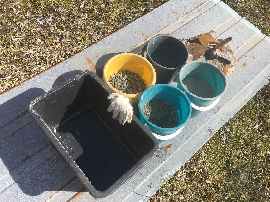 Лучше всего подойдут ведра (например, по 10 литров). Их нужно как минимум два: одним вы будете отмерять твердые материалы, а другим – воду. Если использовать только одно ведро, то после воды его стенки станут мокрыми, к ним будут прилипать песок и цемент. - Инструмент для замеса