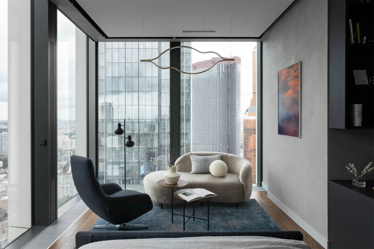 - Современный интерьер и функциональность нашли свое идеальное воплощение в квартире в Москва-Сити.
