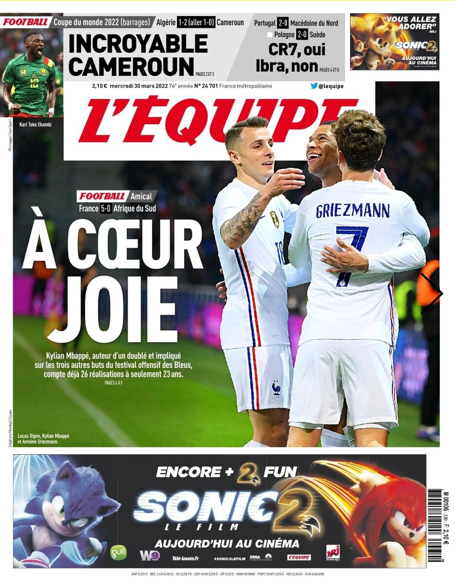 «К всеобщей радости» Через четыре дня после победы, вырванной у Кот-д'Ивуара (2:1) в Марселе, Дидье Дешам коренным образом изменил состав команды, чтобы встретиться с Южной Африкой во вторник вечером на стадионе «Пьер-Моруа» в Лилле. Дешам сделал по меньшей мере 8 замен в стартовом составе. Только Рафаэль Варан, назначенный капитаном в отсутствие Уго Льориса, а также Антуан Гризманн и Оливье Жиру не потеряли места в старте, в то время как Майк Меньян, Джонатан Клаусс и Уильям Салиба получили свой первый старт в сборной. С гиперактивным Килианом Мбаппе, «синие» легко разобрались с ЮАР (5-0), стирая кошмар своего последнего противостояния во время группового матча ЧМ-2010, когда французы уступили южноафриканцам 1:2, заняв в том розыгрыше сенсационное последнее место в группе. За 12 лет много воды утекло и теперь сборная Франции это совсем другая сила. Мбаппе оформил дубль+ассист, Жиру снова забил дежурный гол (Анри нервно закурил). А Бен-Йеддер и Гендузи завершили разгром. #франци